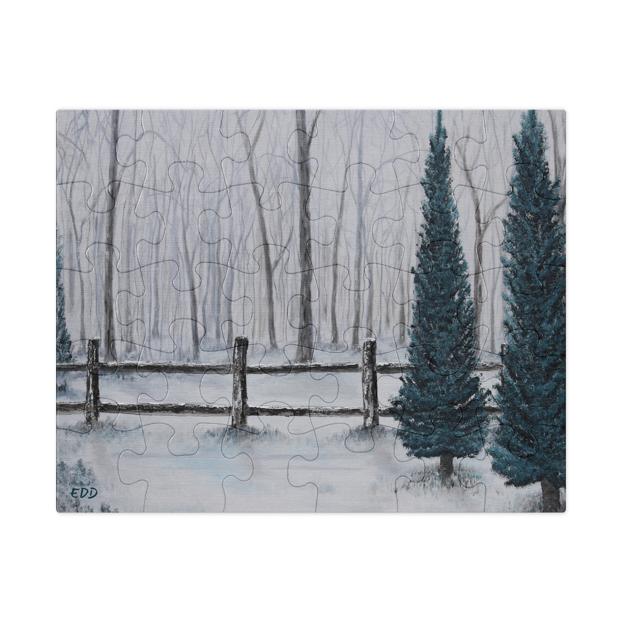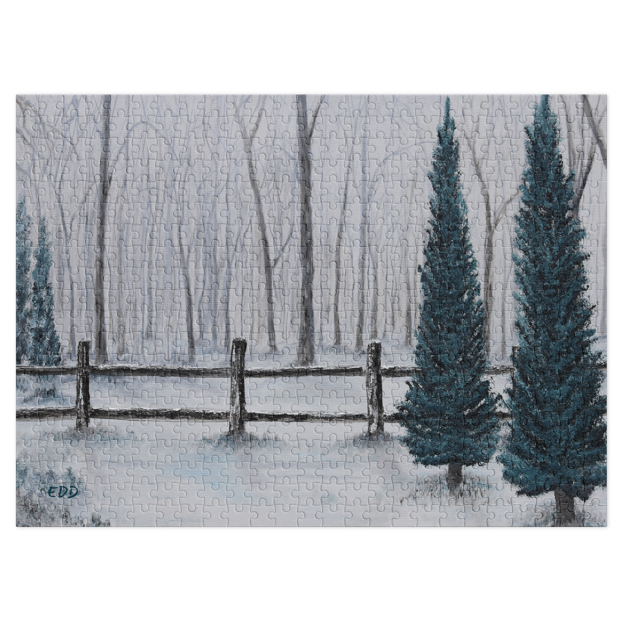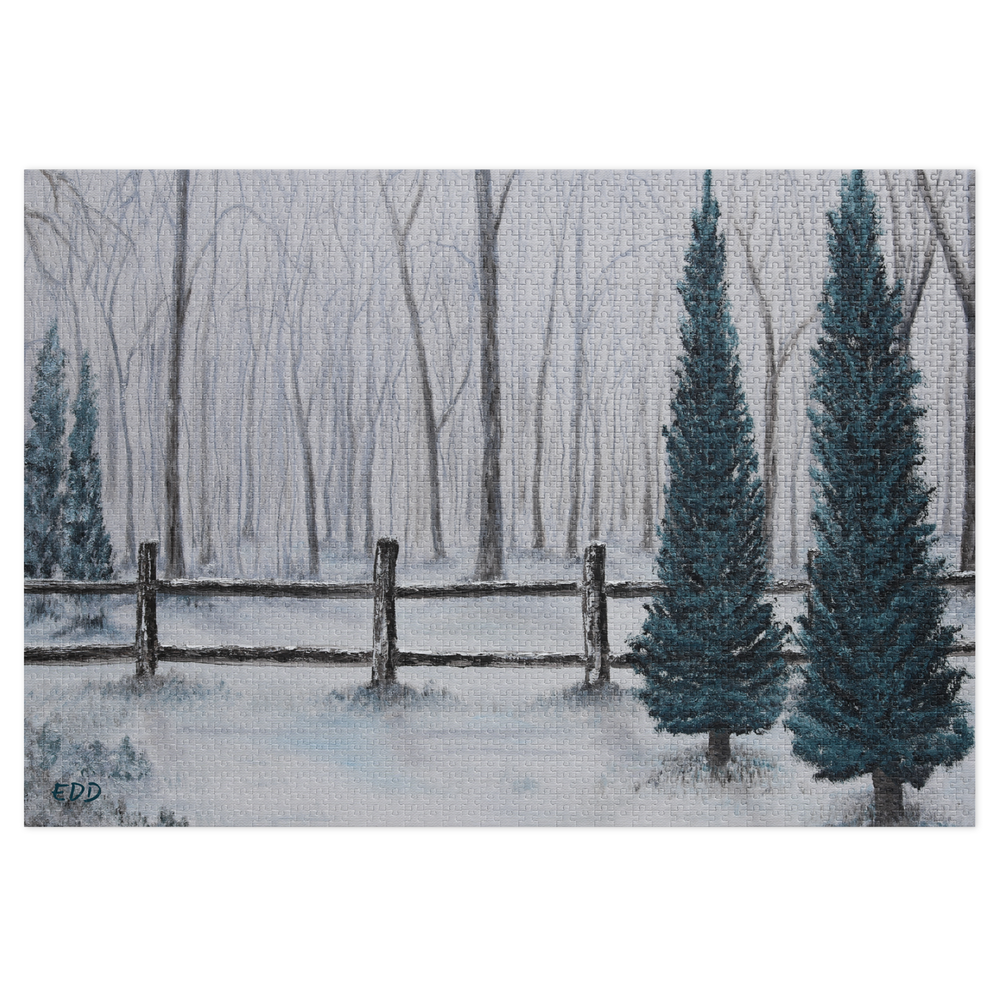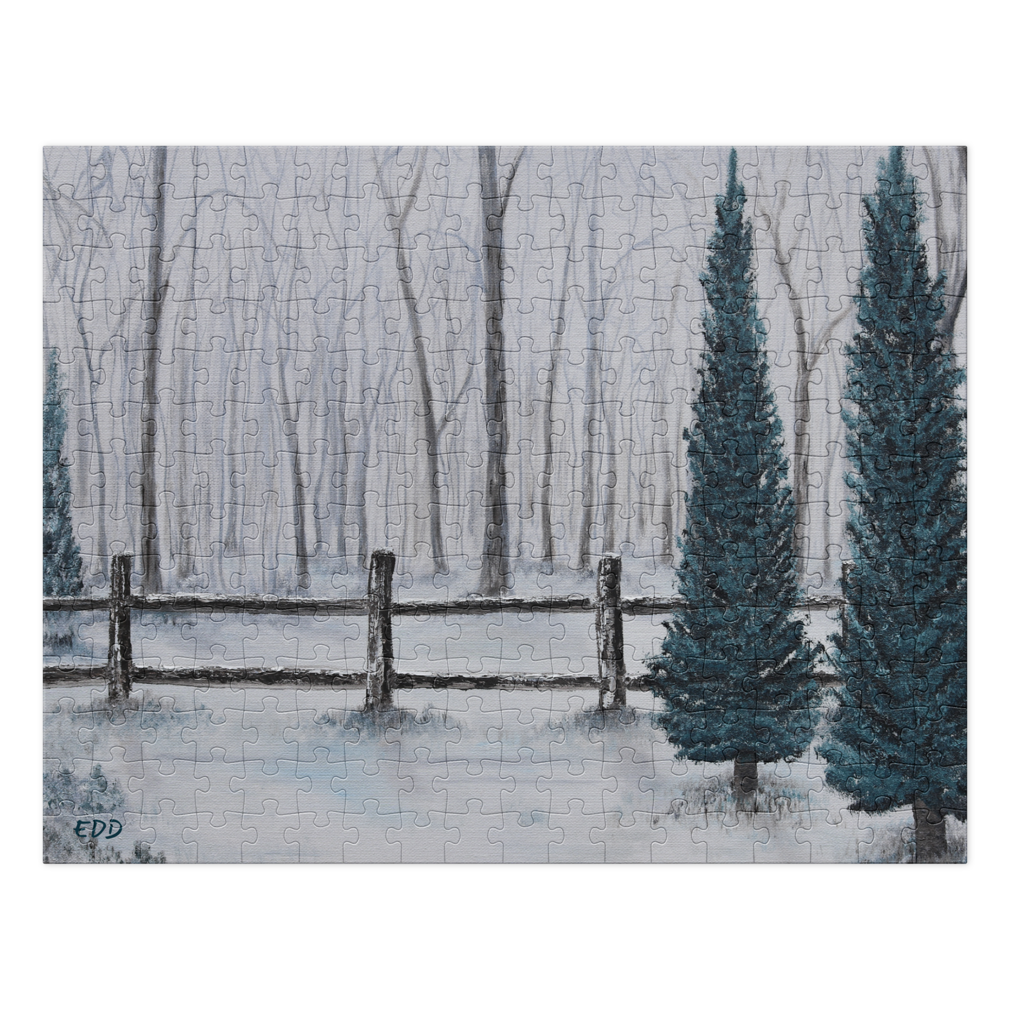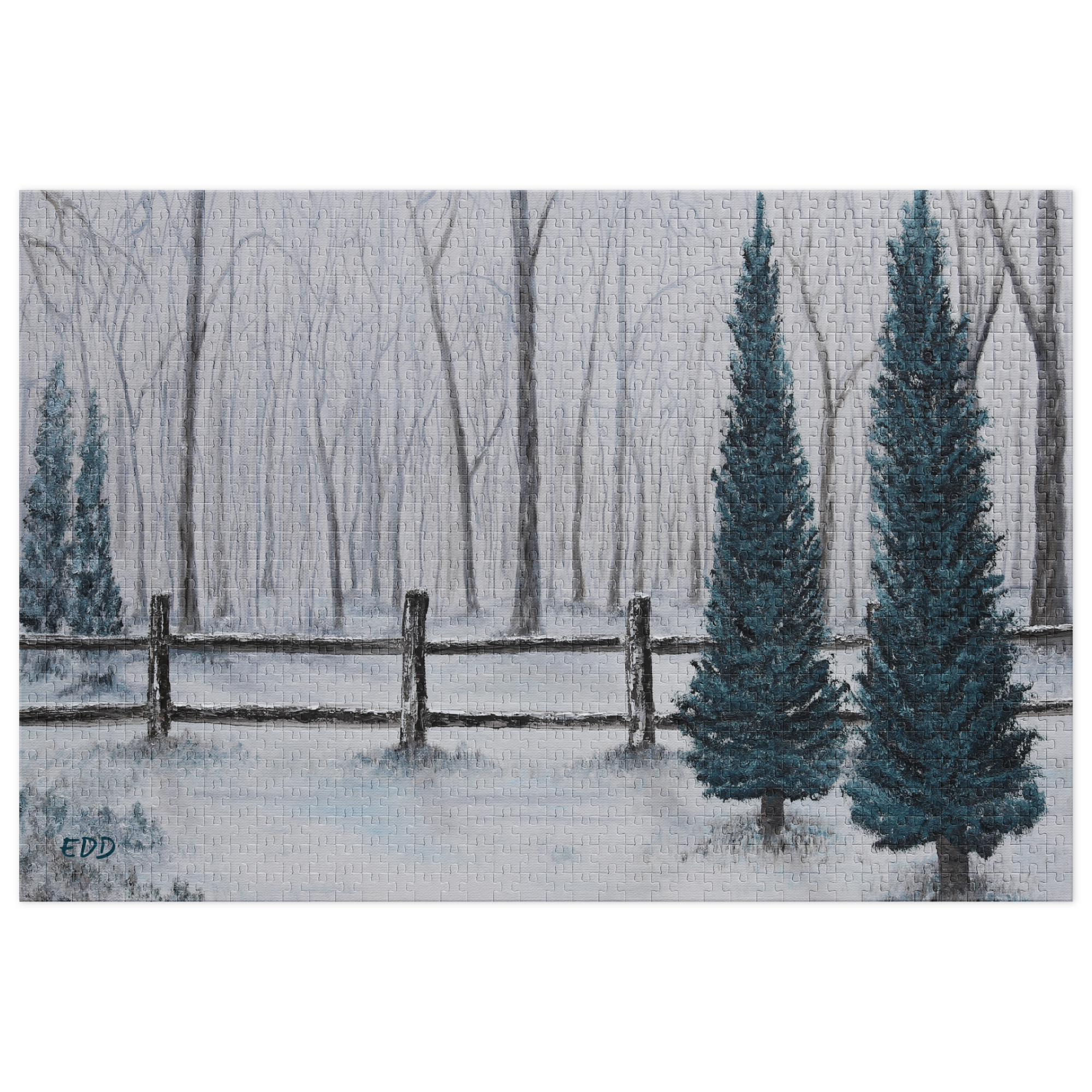 The Tranquil Backyard Evergreens puzzle captures the peacefulness of the deep green trees, rail fence, and snow-covered grass in every brushstroke.