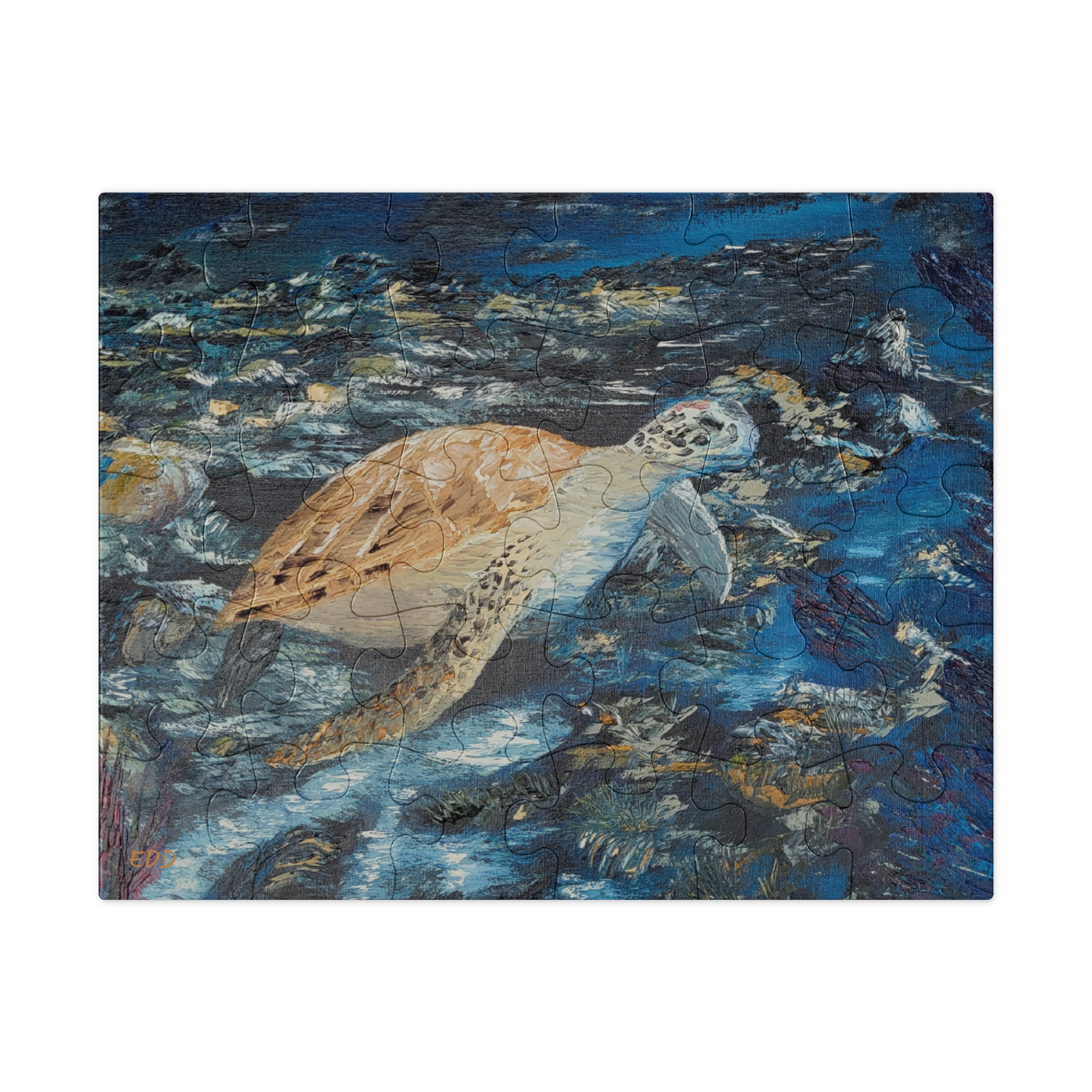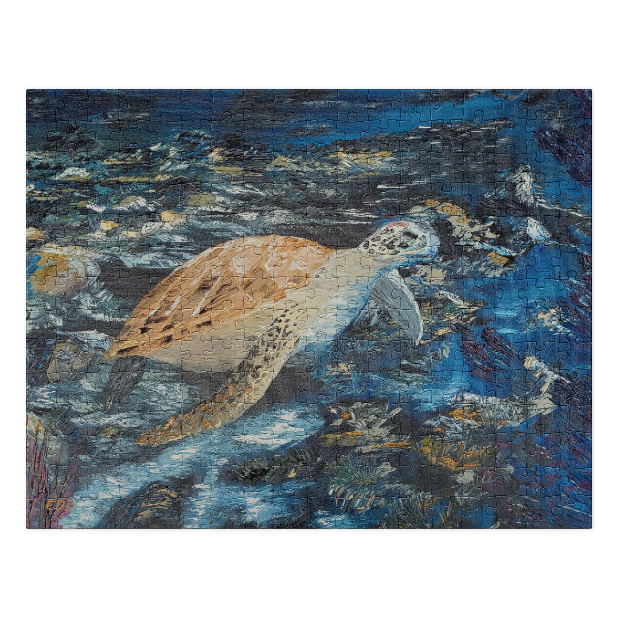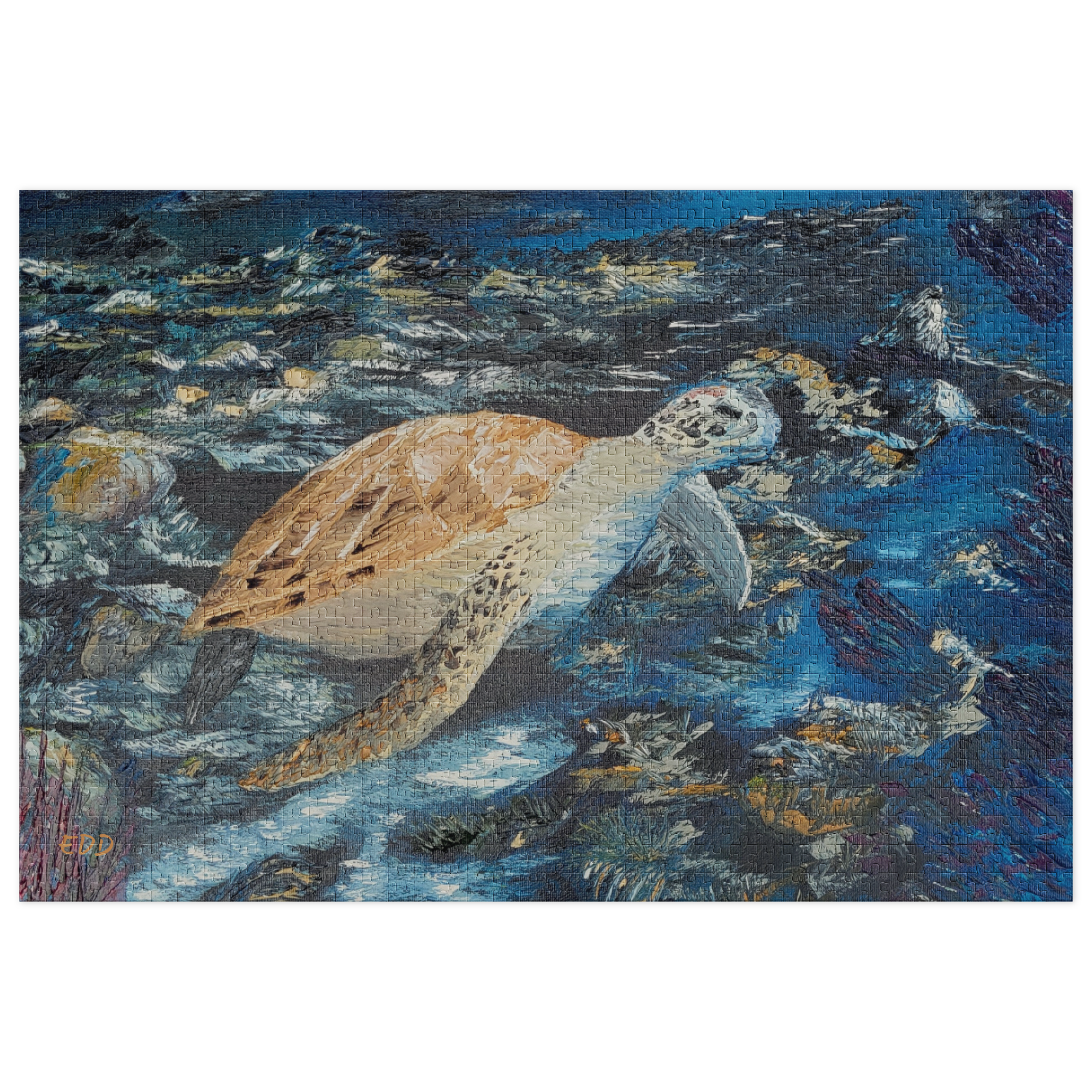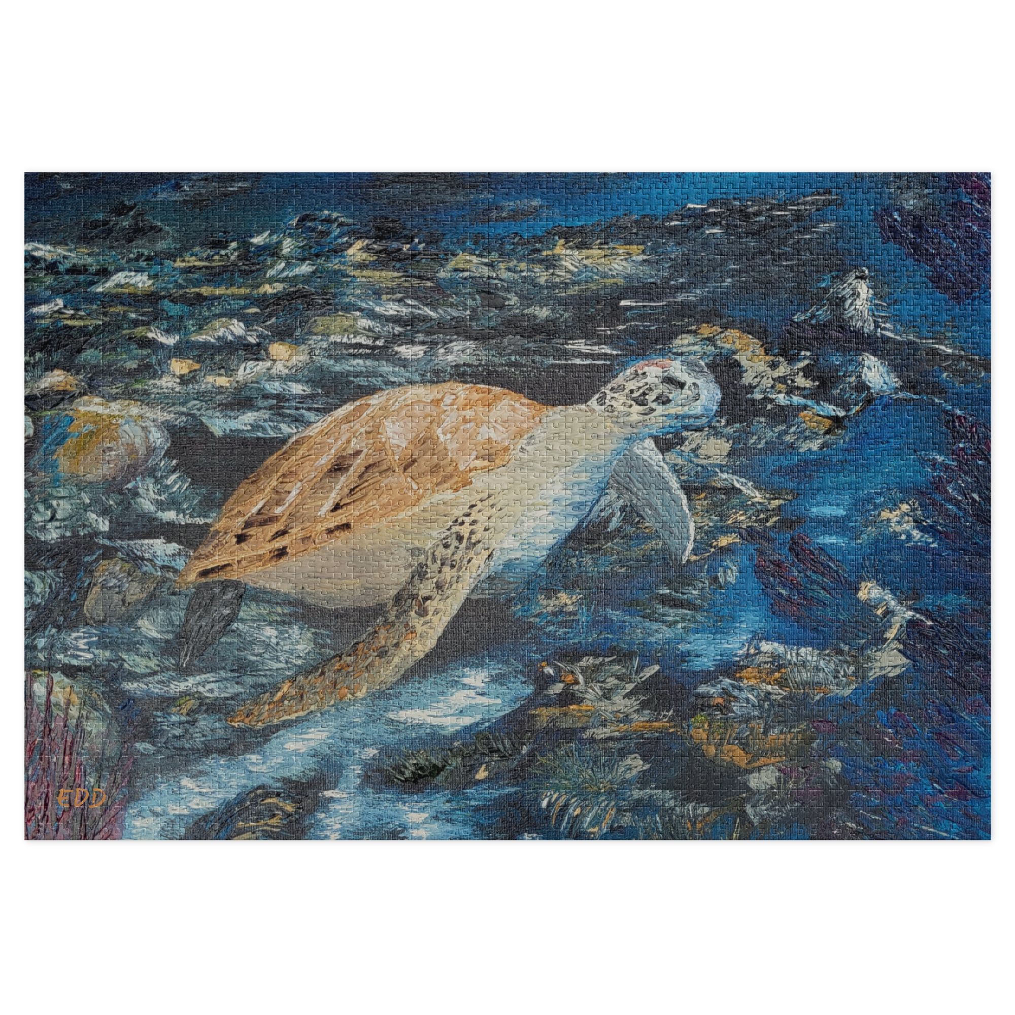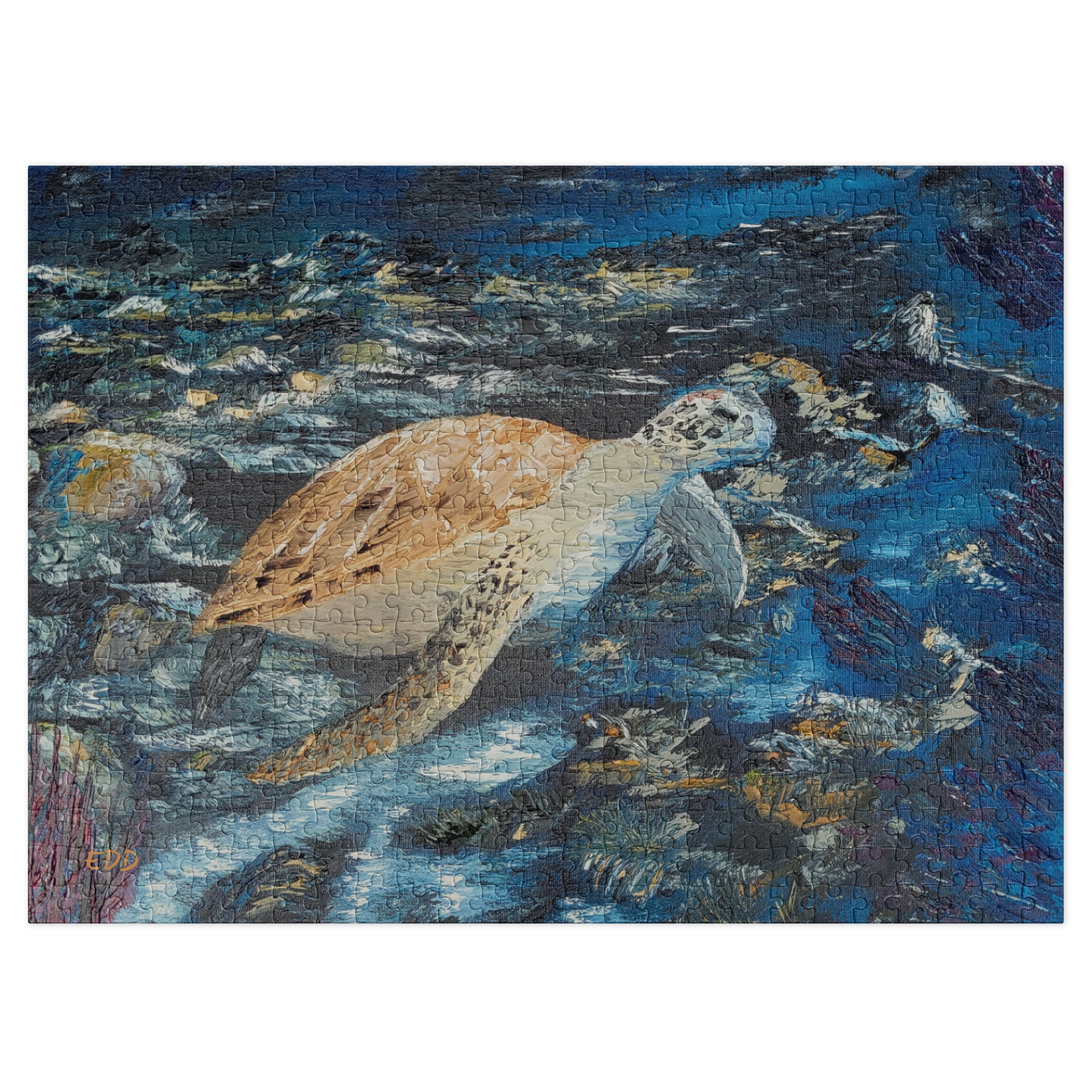 The Turtle Glide puzzle depicts a lone sea turtle glides through the dark blue currents, as the subtly colored sea plant life evokes a sense of calmness.